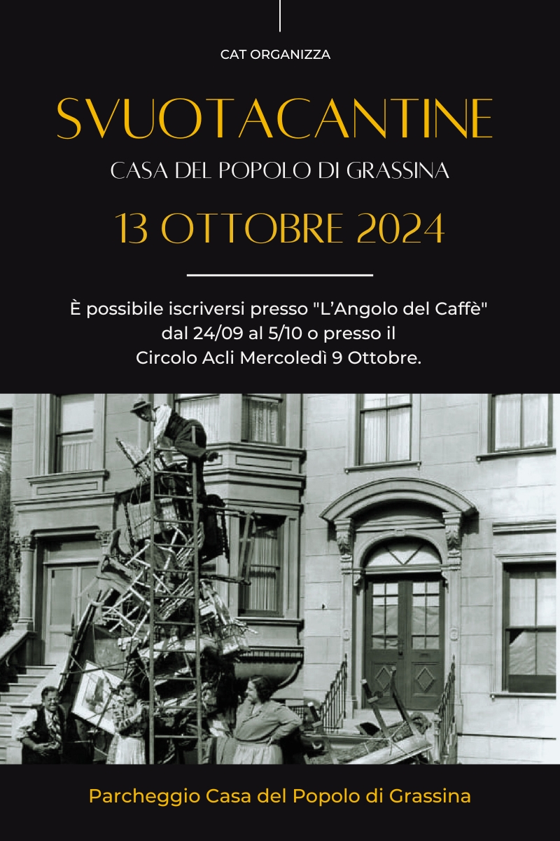 Anche quest’anno il CAT propone la consueta giornata SVUOTACANTINE. Al parcheggio della Casa del Popolo di Grassina Domenica 13 Ottobre l’iniziativa che da anni accompagna la comunità e allieta le nostre domeniche.